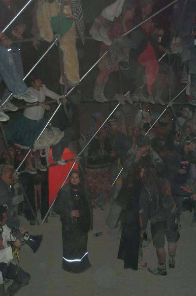 Lawrence and Jen (at center) look on as warriors fight in the Thunderdome