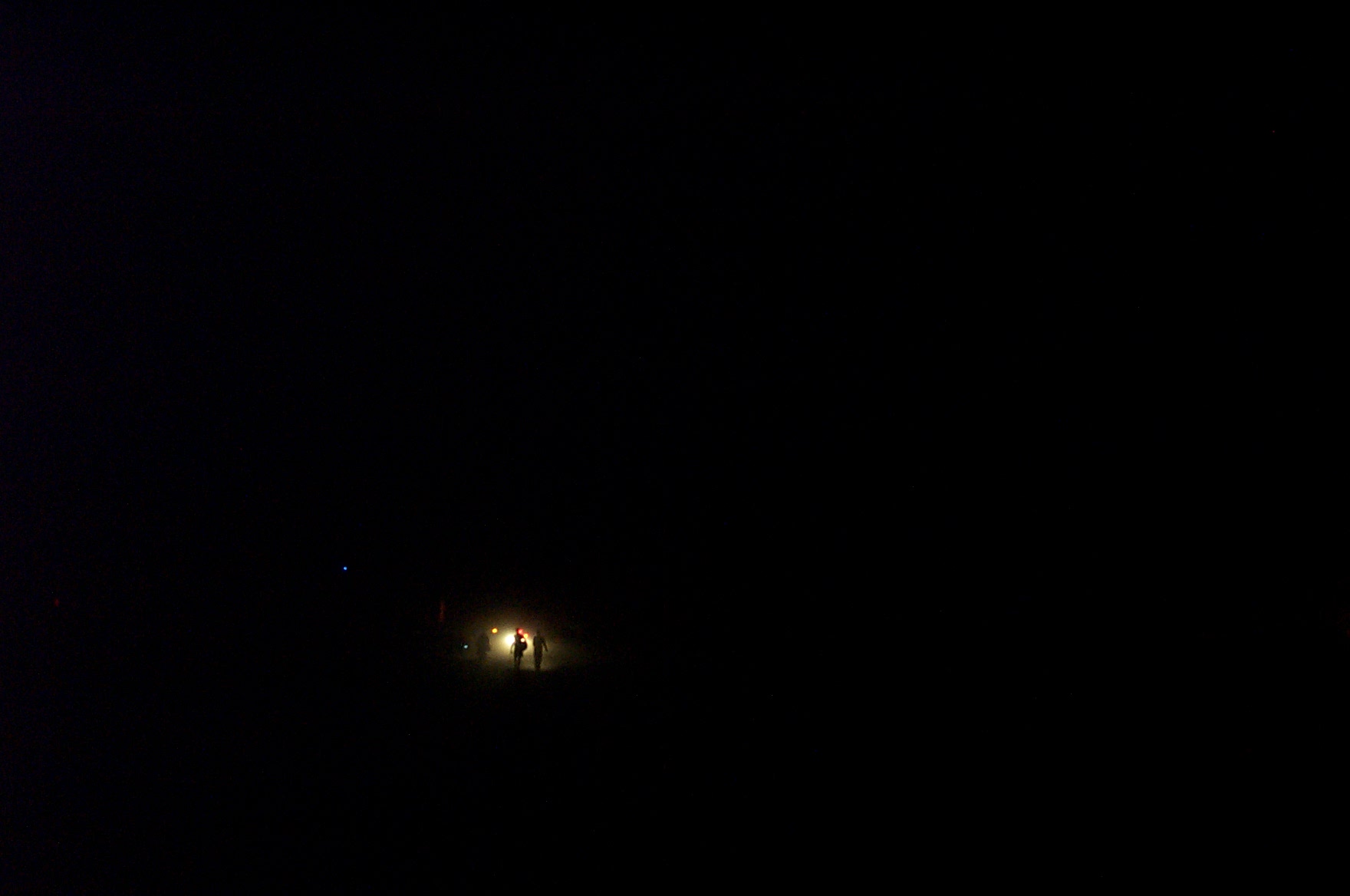 In the darkness after the Temple Burn, a single car illuminates the dust around pedestrians