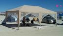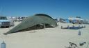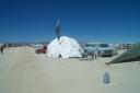 | Our neighbor George and his crew had a parachute on PVC pipe arches. They also had a sink, the drain for which can be seen emptying onto the big black gray-water evaporation tarp. |