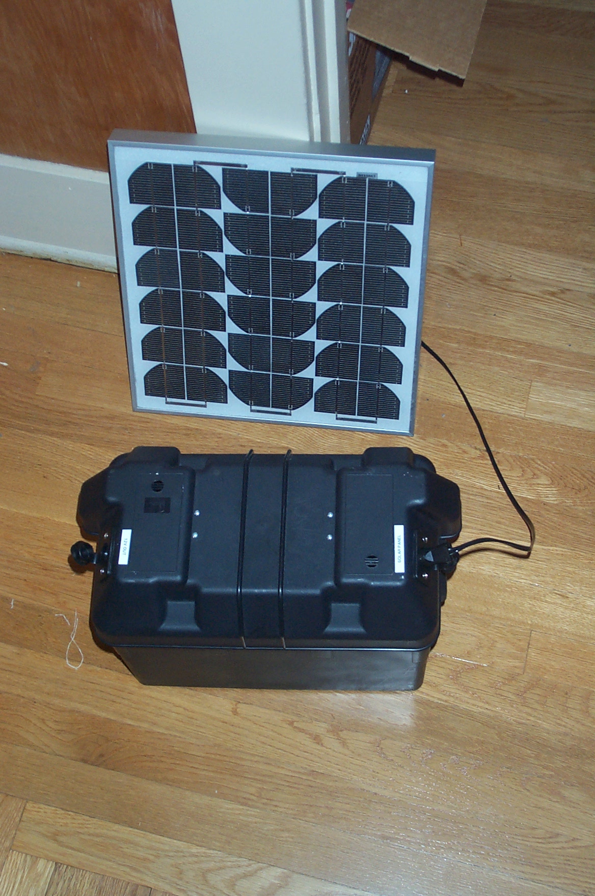 I added two cigarette lighter sockets to this battery box, one for solar panel input and one for 12V output. We used it to power 6 fluorescent lights in our camp.