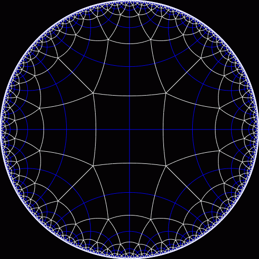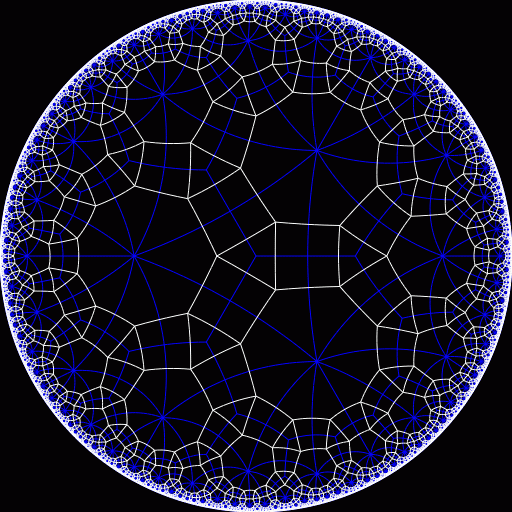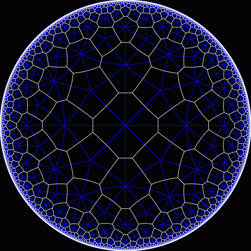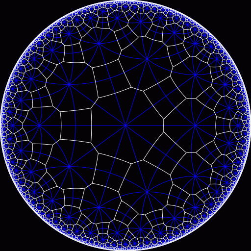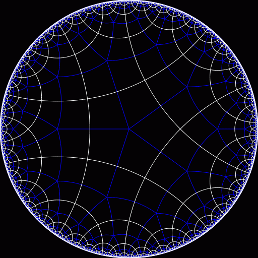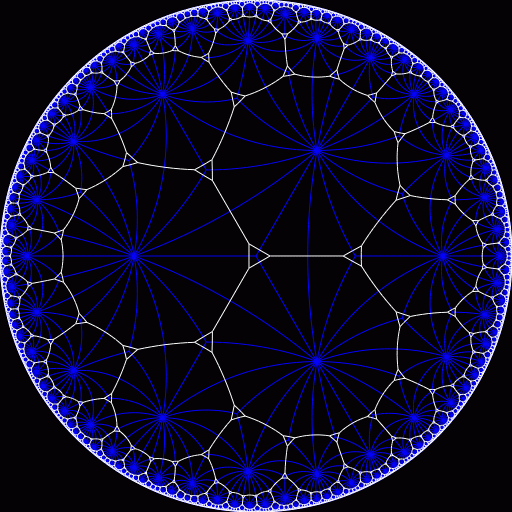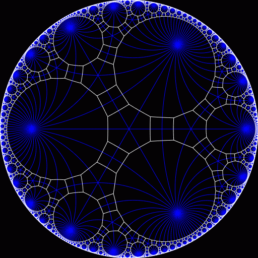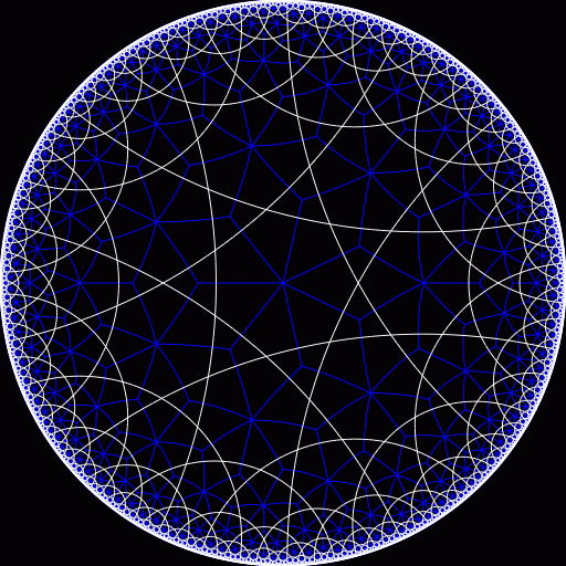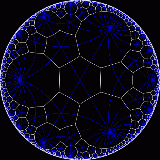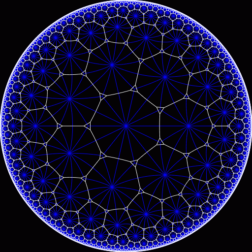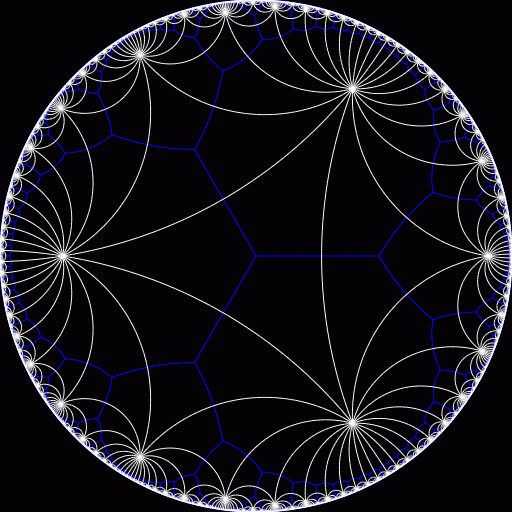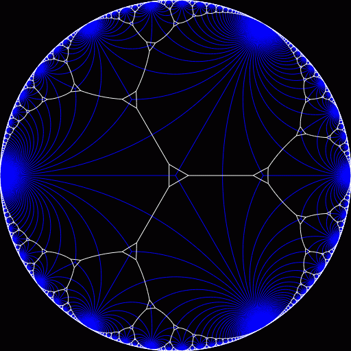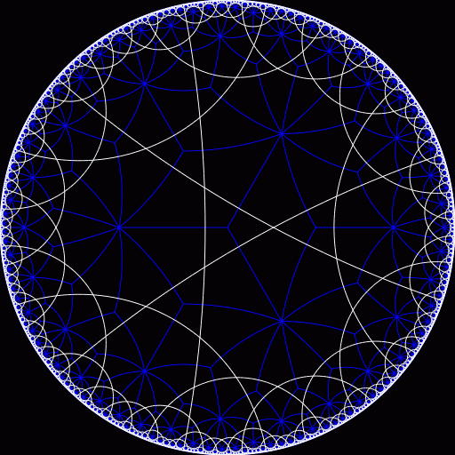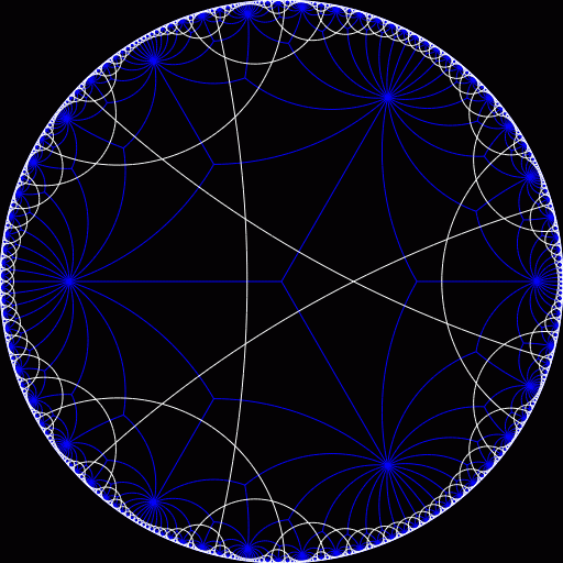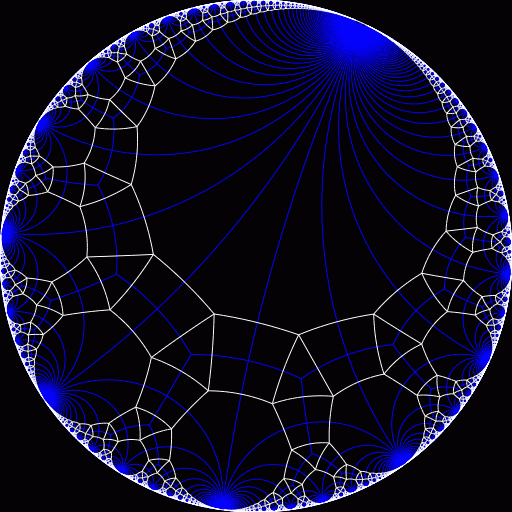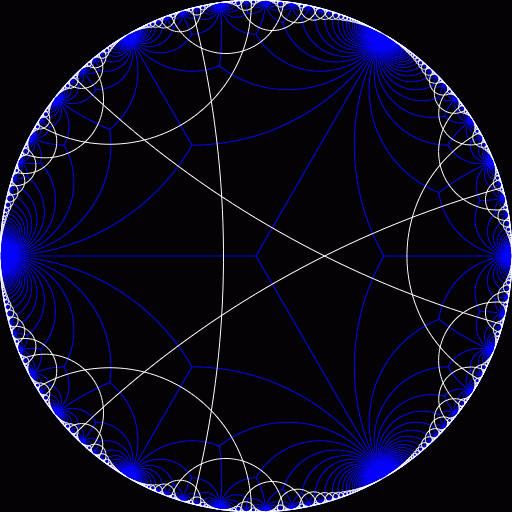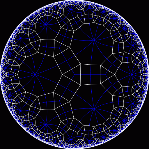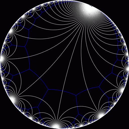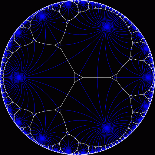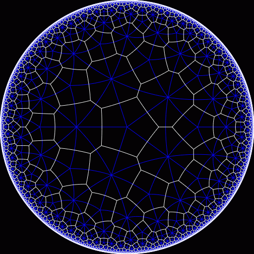Each tesselation is represented by a Schlafli symbol of the form {p,q}, which means that q regular p-gons surround each vertex. There exists a hyperbolic tesselation {p,q} for every p,q such that (p-2)*(q-2) > 4.