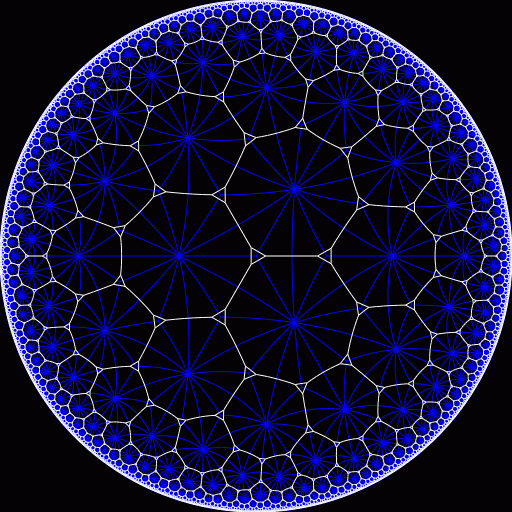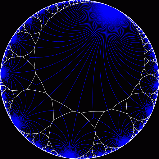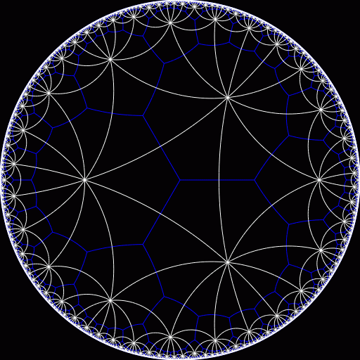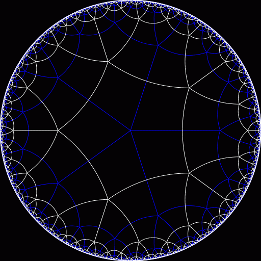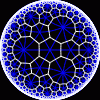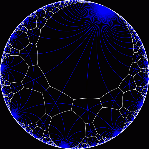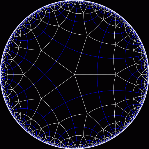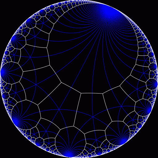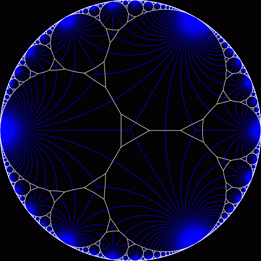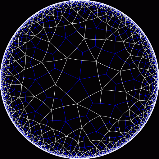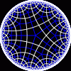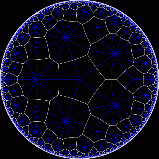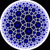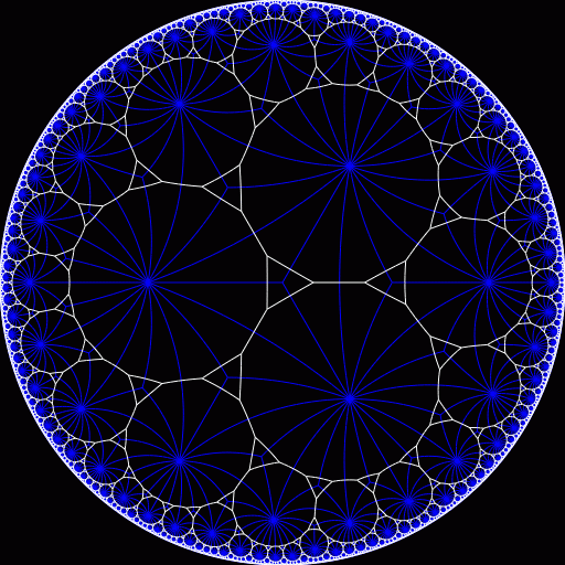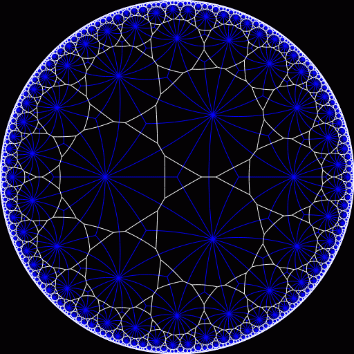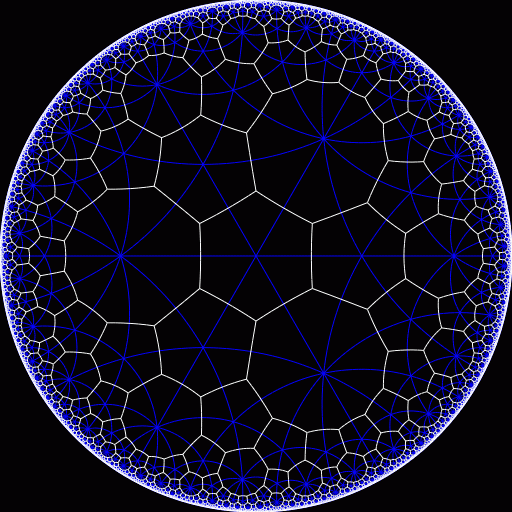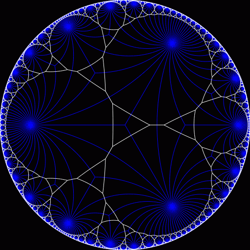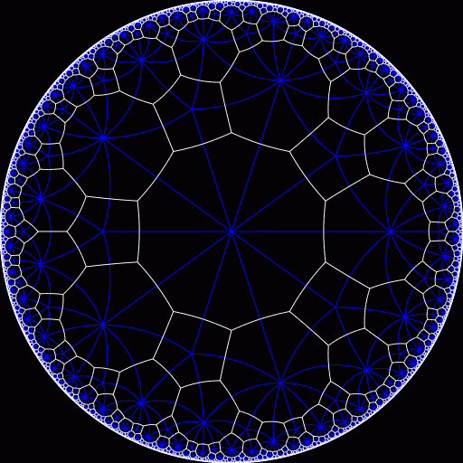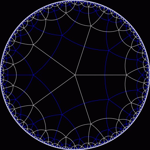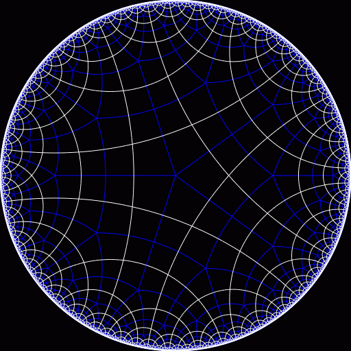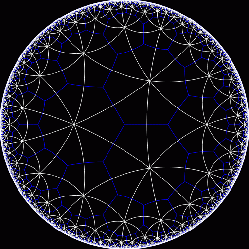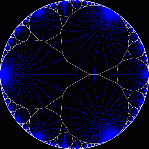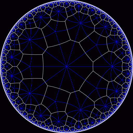 Each tesselation is represented by a Schlafli symbol of the form {p,q}, which means that q regular p-gons surround each vertex. There exists a hyperbolic tesselation {p,q} for every p,q such that (p-2)*(q-2) > 4.
