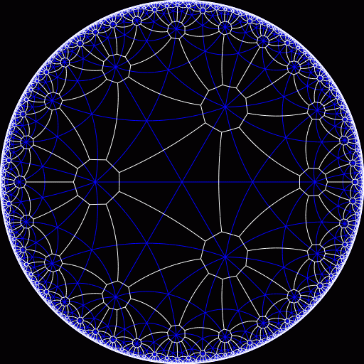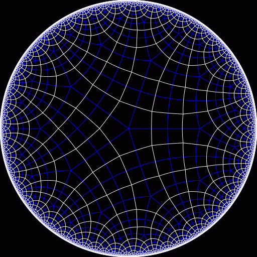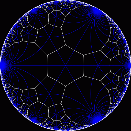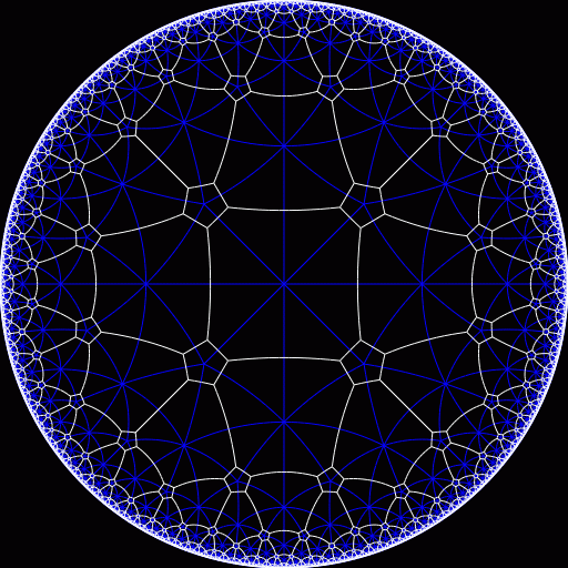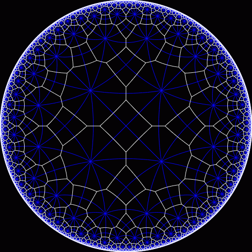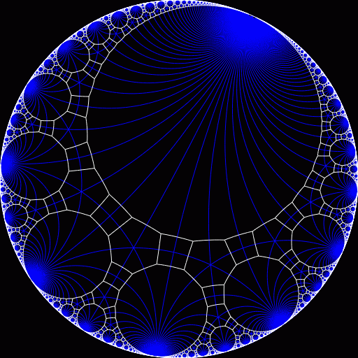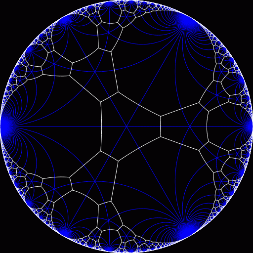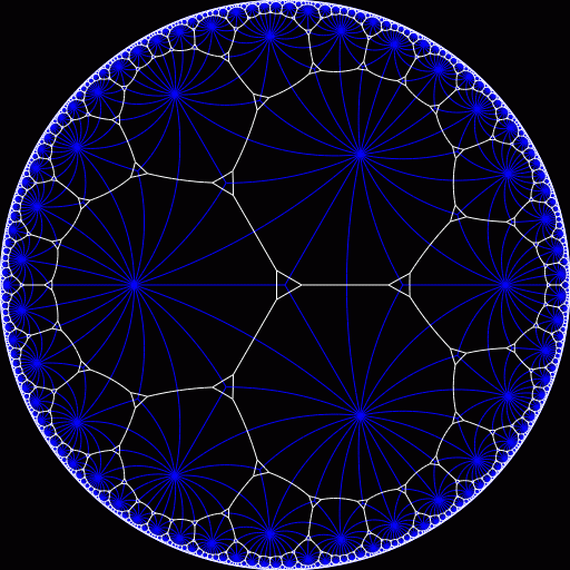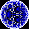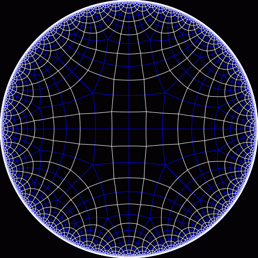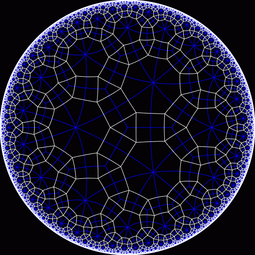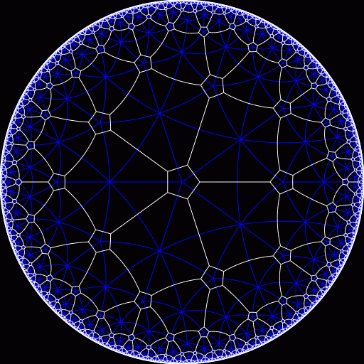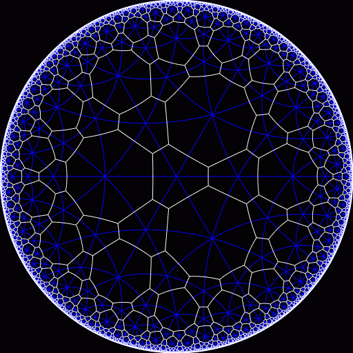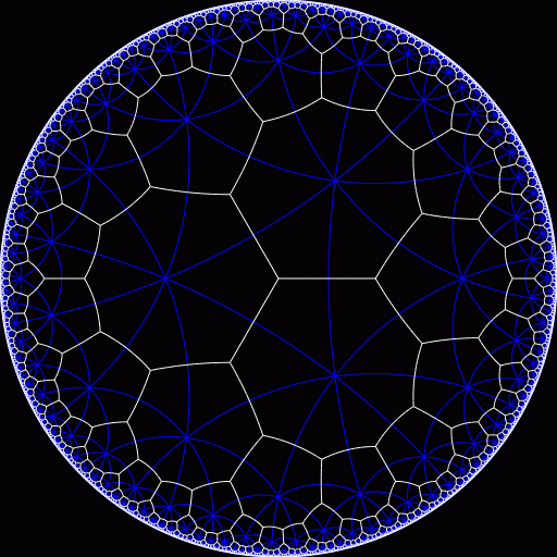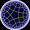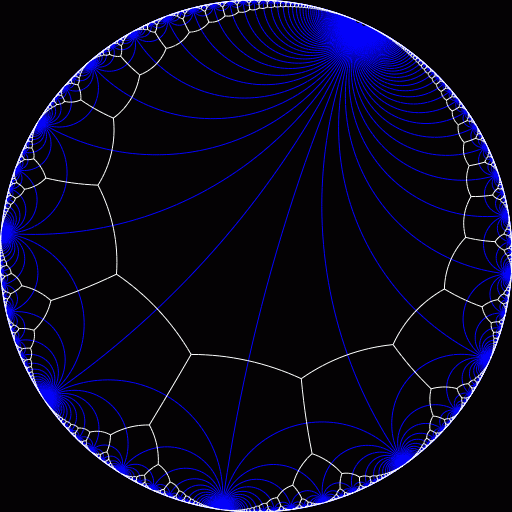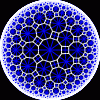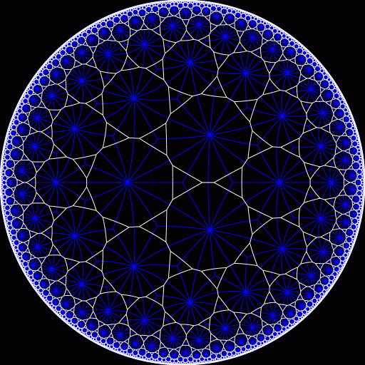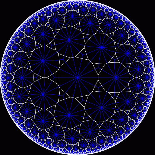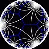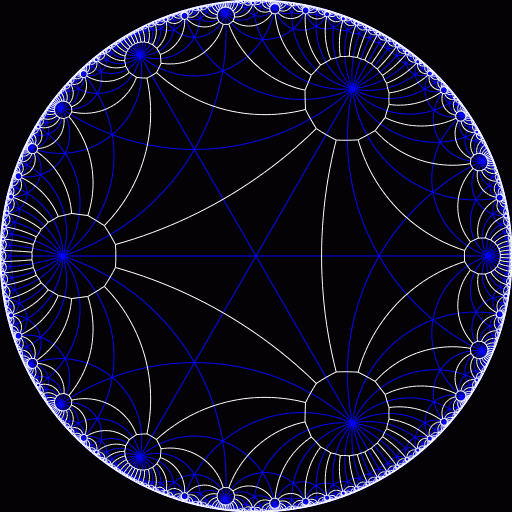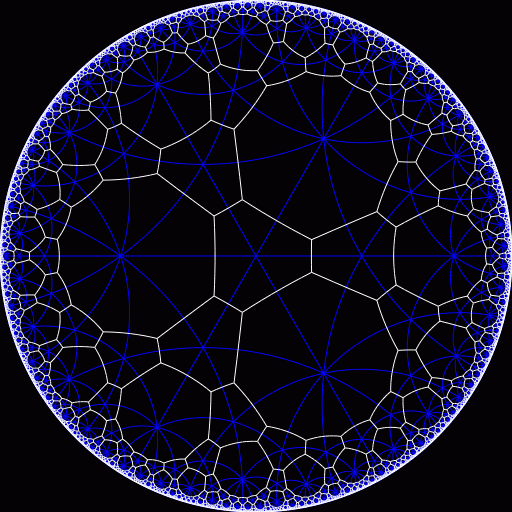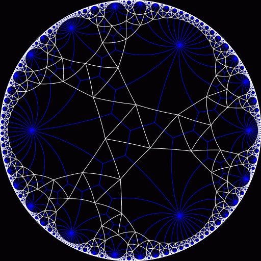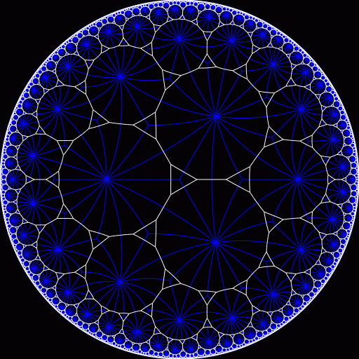 Each tesselation is represented by a Schlafli symbol of the form {p,q}, which means that q regular p-gons surround each vertex. There exists a hyperbolic tesselation {p,q} for every p,q such that (p-2)*(q-2) > 4.